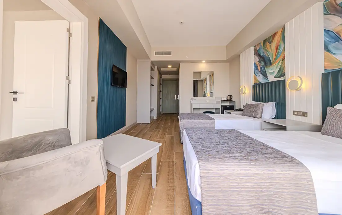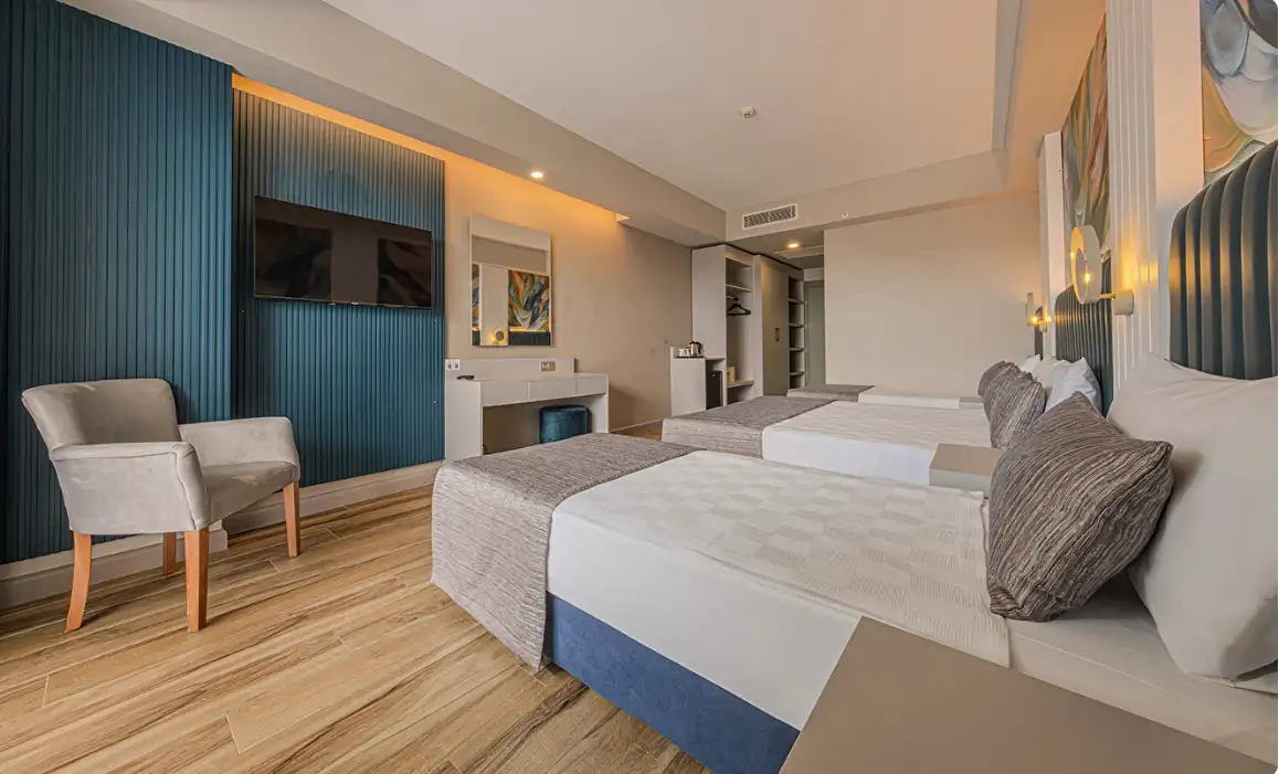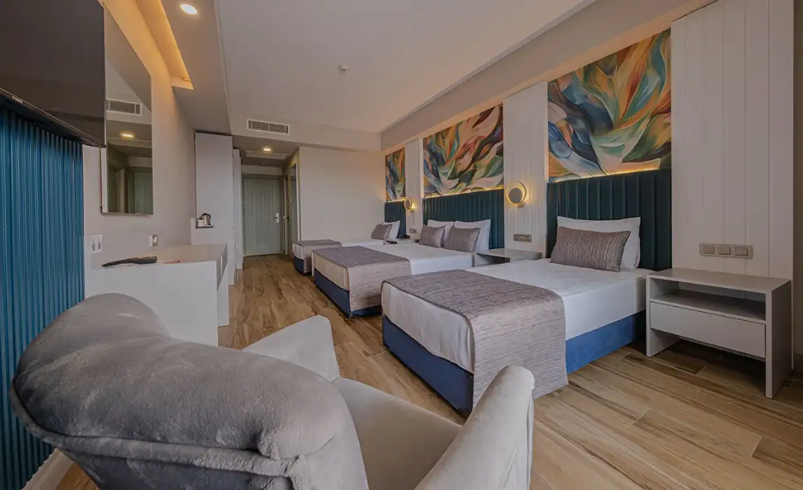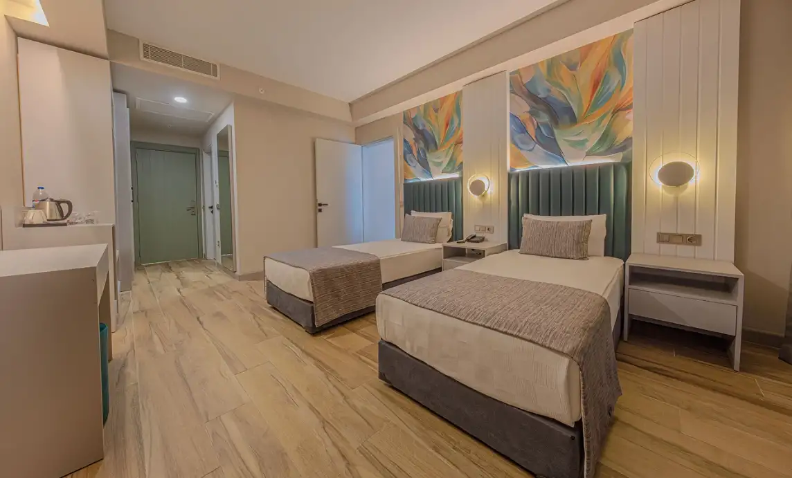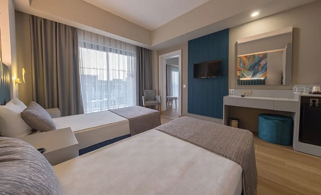 Aile Odası : Max. 4 kişi Yaklaşık 40m² Standart odalarda bulunan tüm özellikler ile beraber ayrıca ara kapı ile ayrılan iki yatak odası da bulunmaktadır. Bu odalarda en fazla 4 yetişkin konaklayabilmektedir.