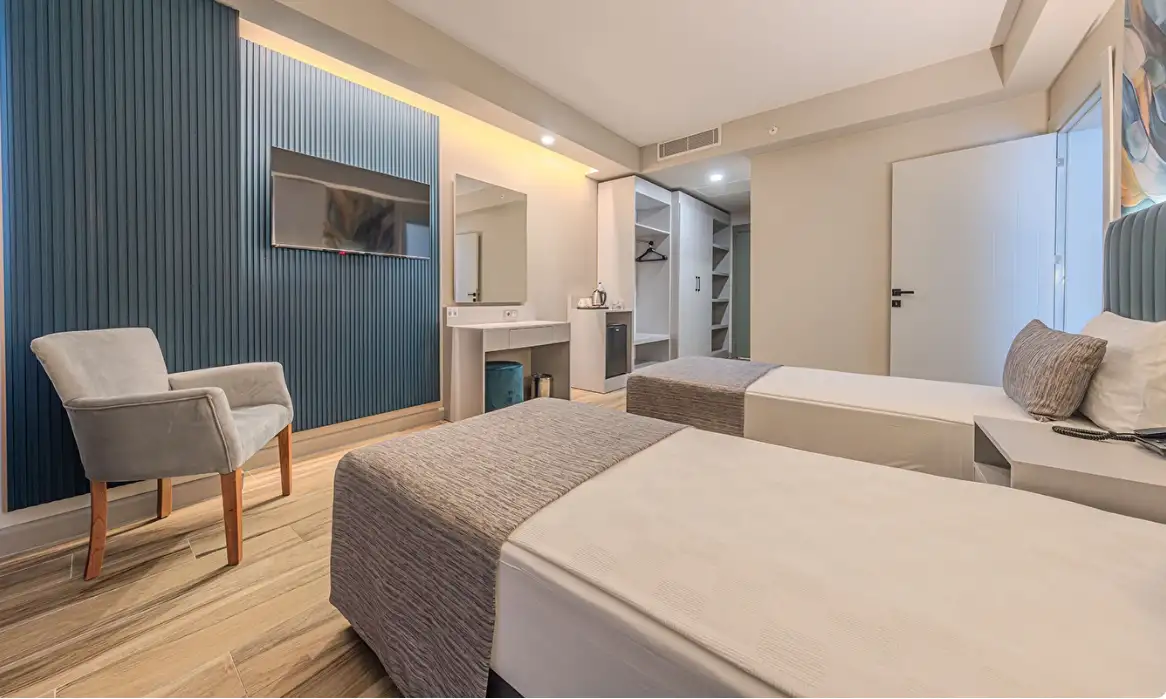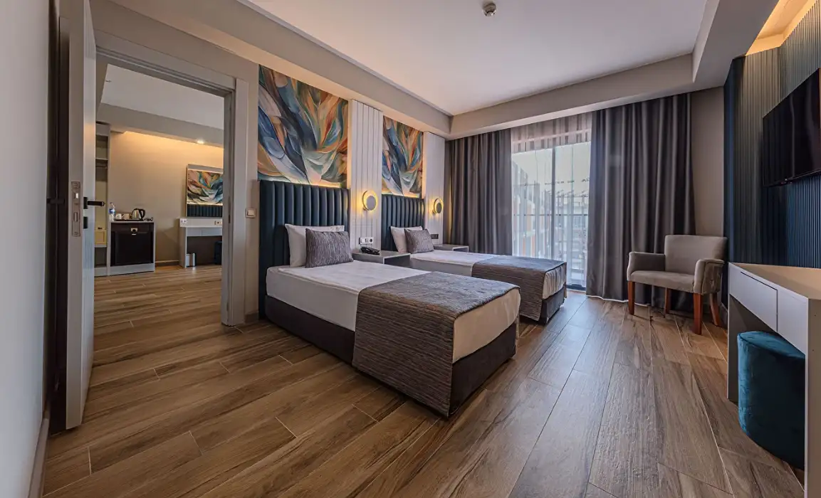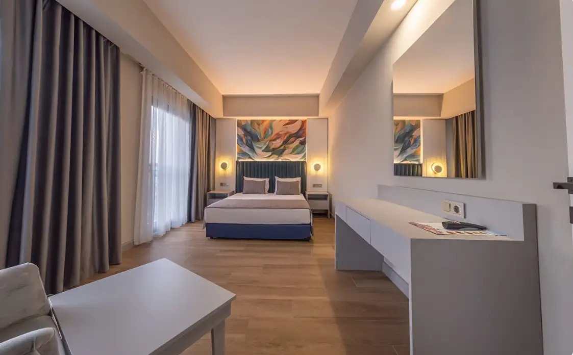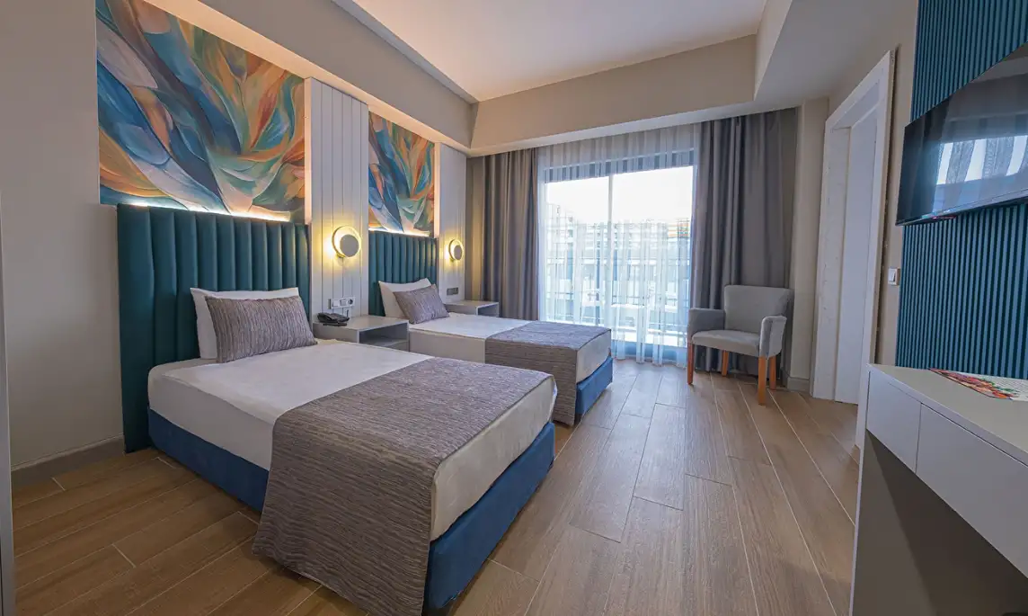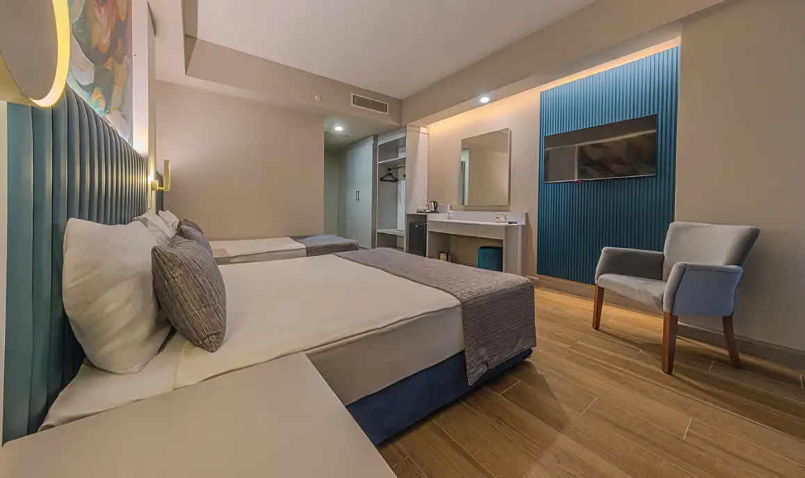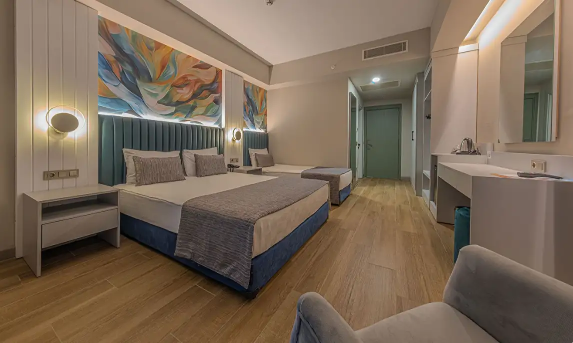 Aile Odası : Max. 4 kişi Yaklaşık 40m² Standart odalarda bulunan tüm özellikler ile beraber ayrıca ara kapı ile ayrılan iki yatak odası da bulunmaktadır. Bu odalarda en fazla 4 yetişkin konaklayabilmektedir.
