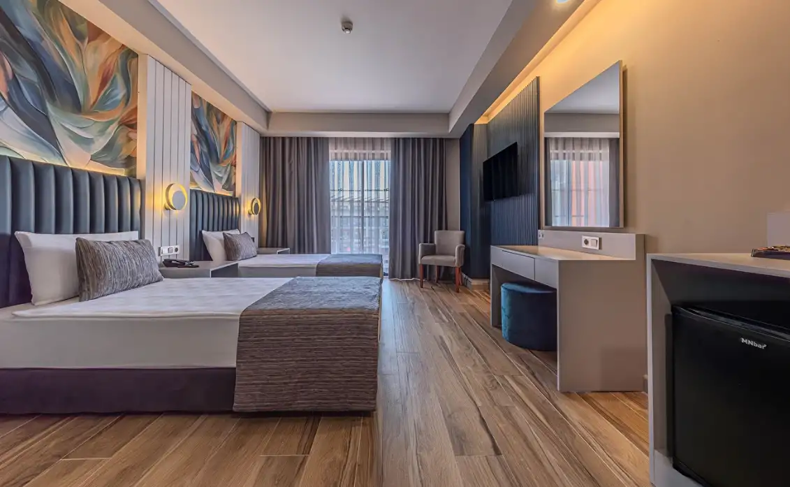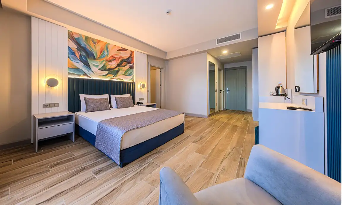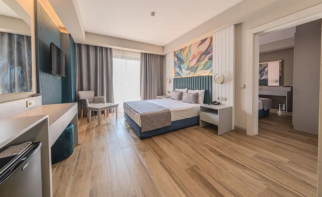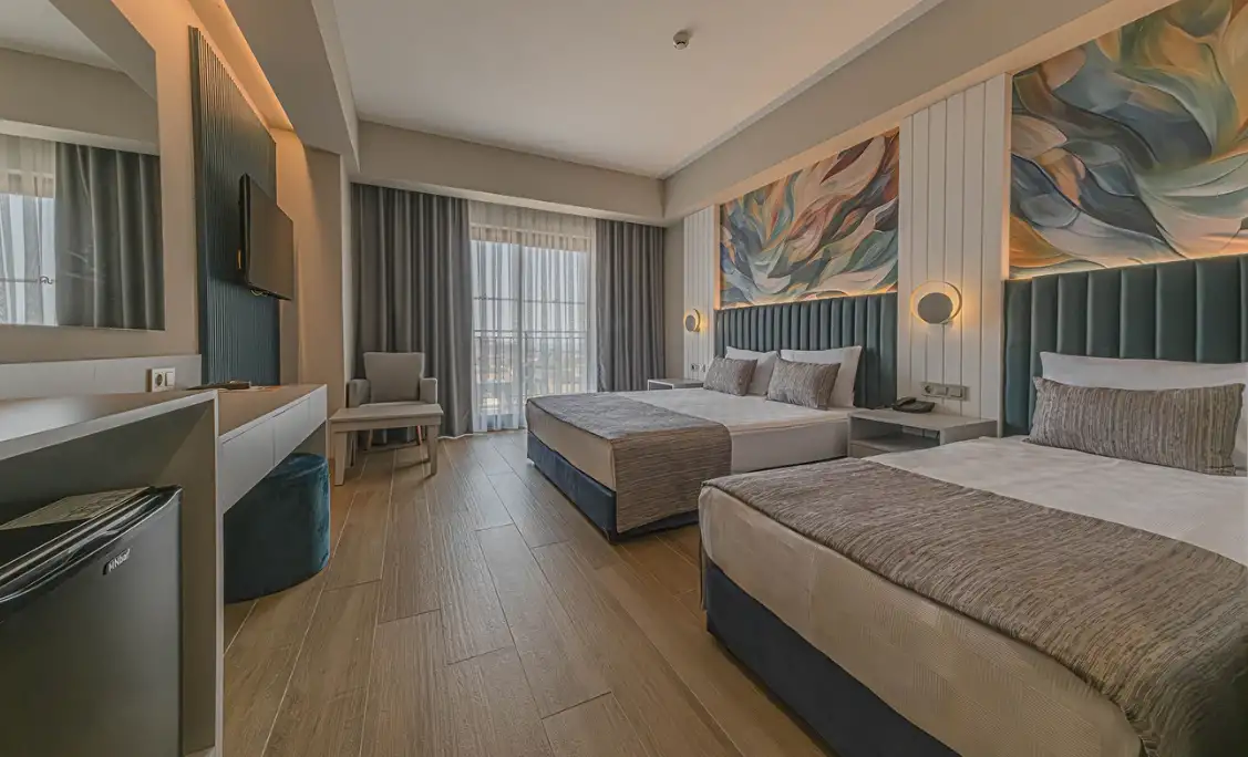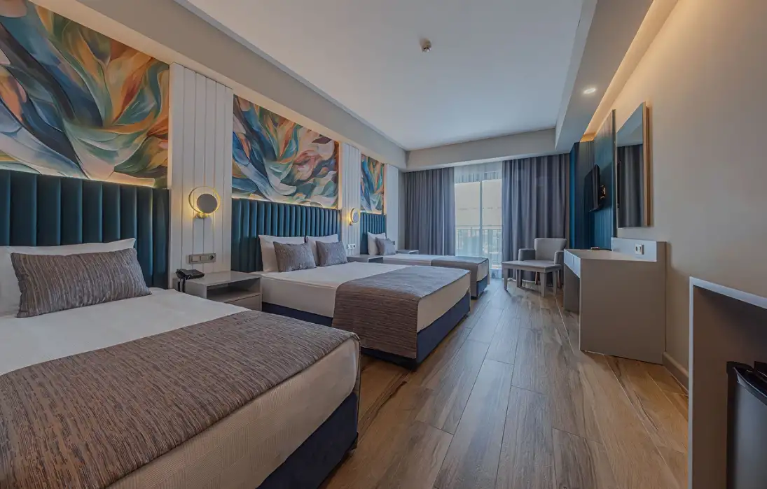 Aile Odası : Max. 4 kişi Yaklaşık 40m² Standart odalarda bulunan tüm özellikler ile beraber ayrıca ara kapı ile ayrılan iki yatak odası da bulunmaktadır. Bu odalarda en fazla 4 yetişkin konaklayabilmektedir.