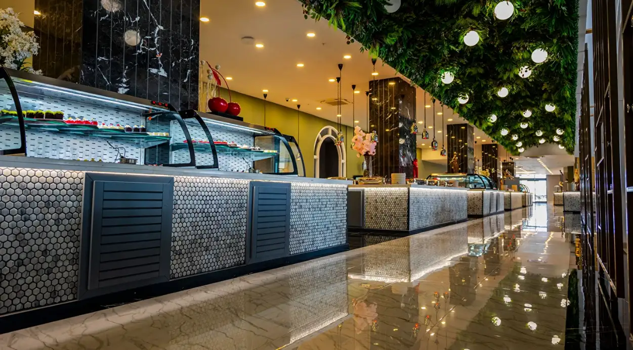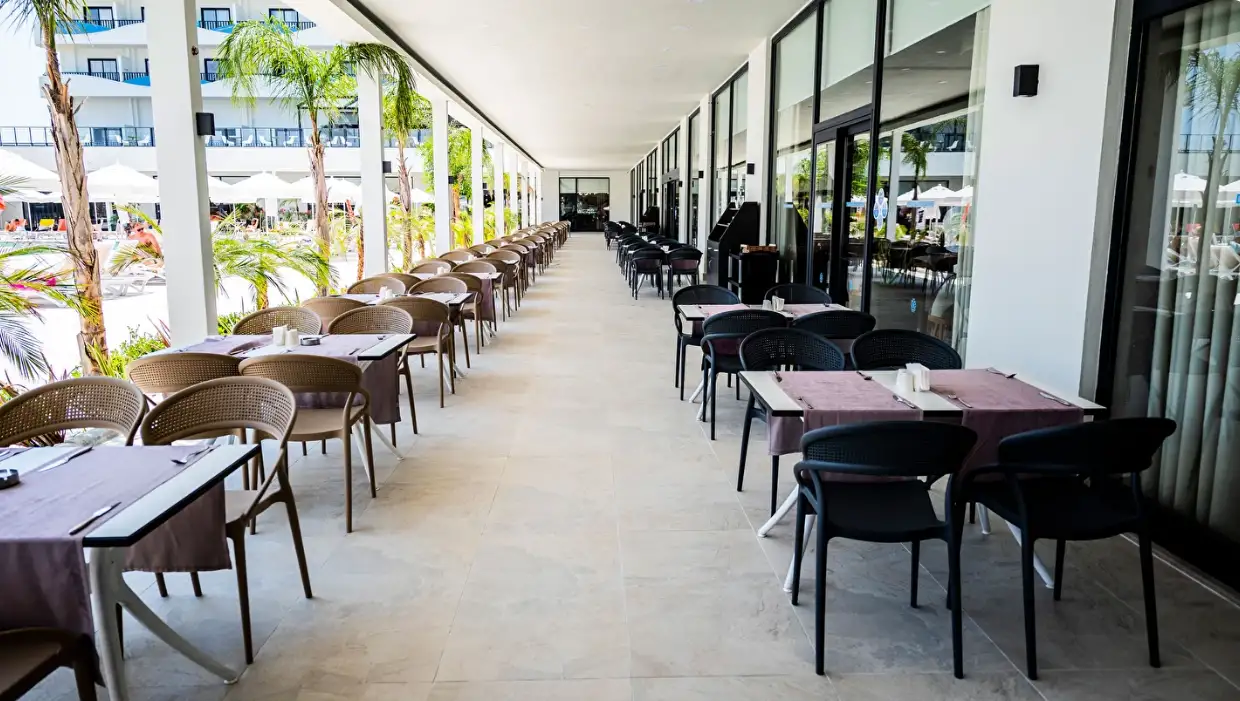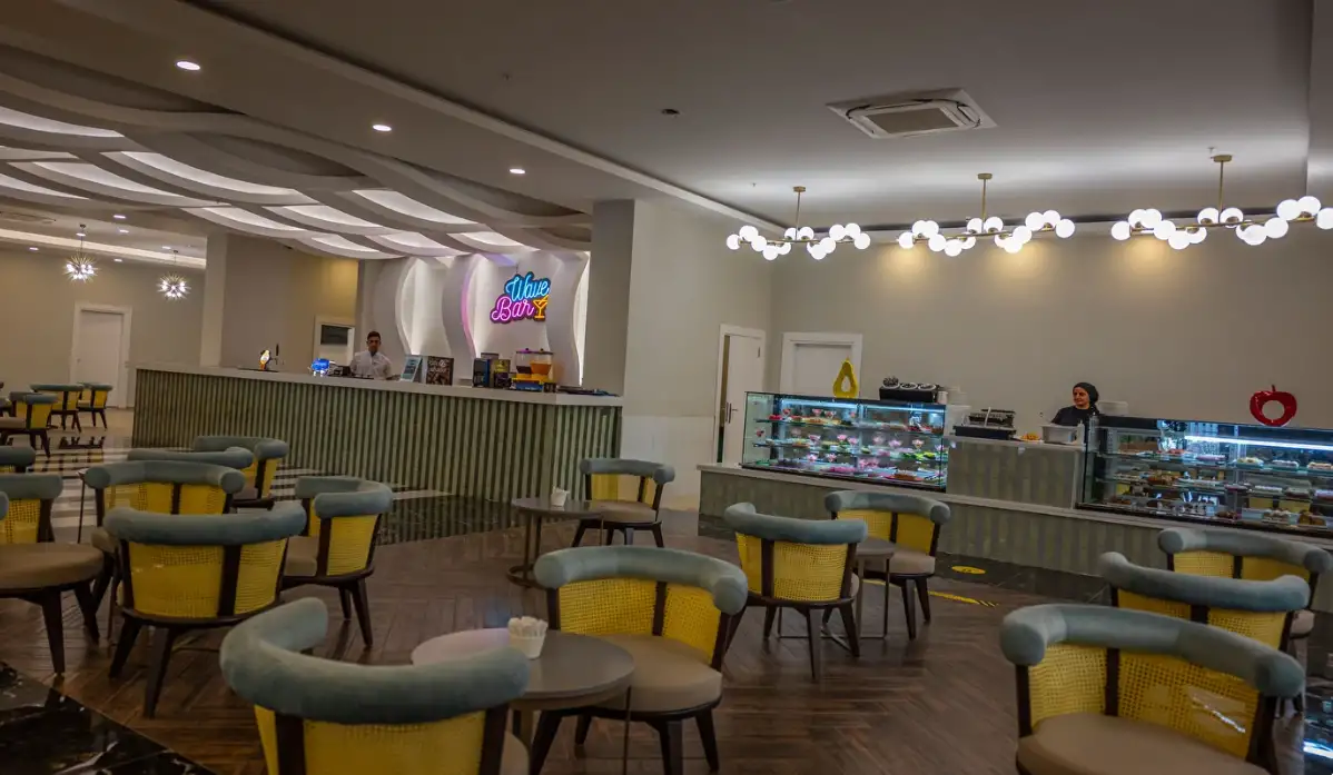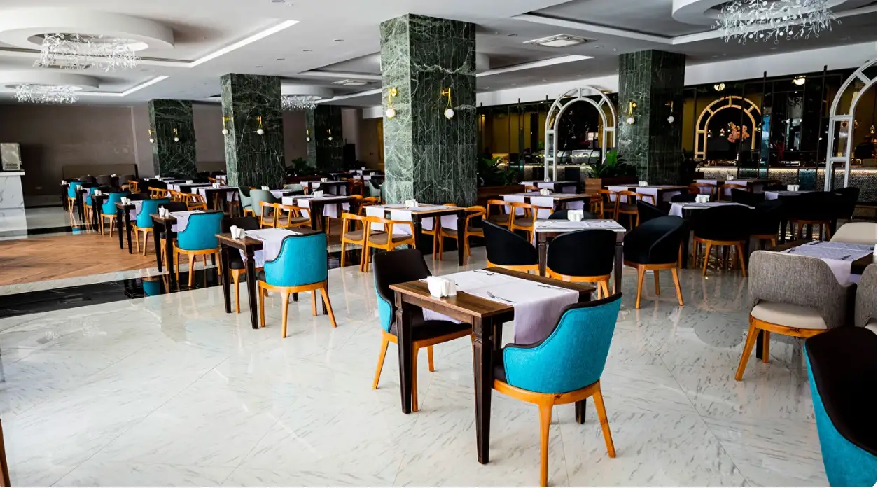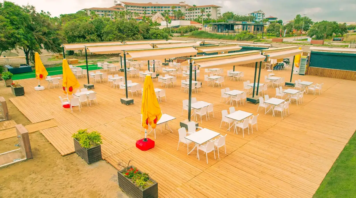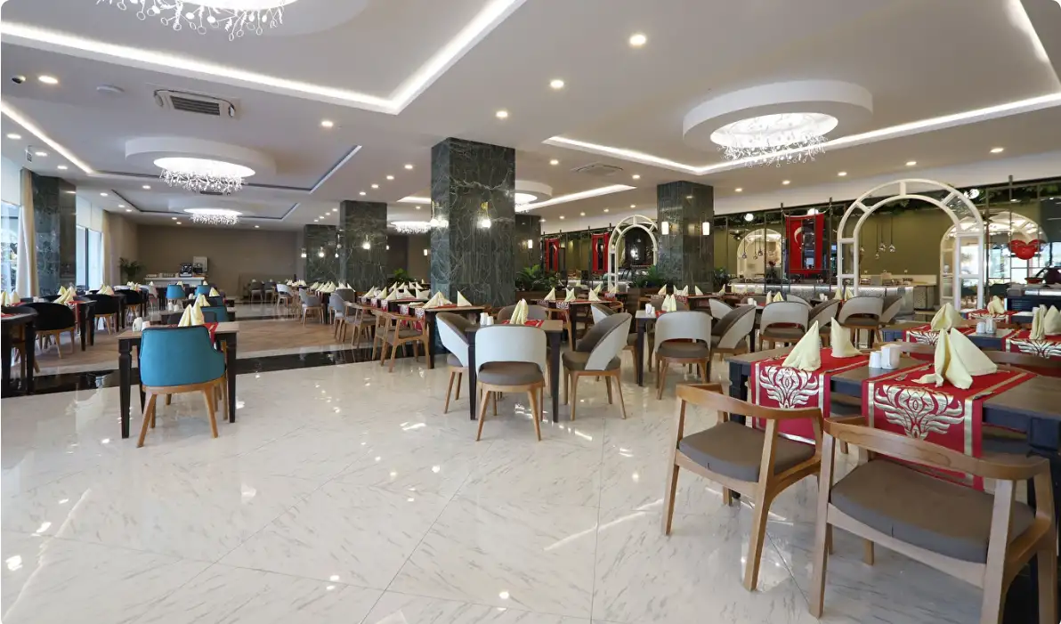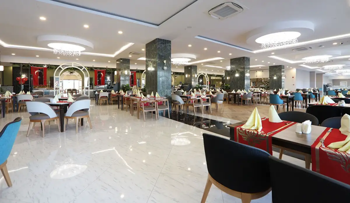 Her şey dahil konsepti sabah saat 10:00'dan 24:00'a kadar sürmektedir. Kahvaltı ile başlayıp, geç kahvaltı, öğle yemeği, snack, kahve ve kek, akşam yemeği ve gece yarısı çorba içermektedir. Kahvaltı, öğle yemeği ve akşam yemeği ana restoranda servis edilir. Kahve-kek servisi lobideki pastanededir. Konuklar tatilleri süresince sadece bir A'la Carte Restoranı (rezervasyonlu) bir defaya mahsus ücretsiz kullanabilirler (En az 5 gece konaklama). Her şey dahil konsepti kapsamında sadece yerli alkollü – alkolsüz içecekler ücretsizdir
